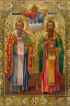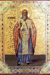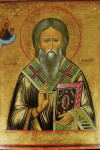 Свяще́ния пома́занием и муче́ния кро́вию украси́лся еси́, сла́вне Вла́сие,/ и сия́еши всю́ду, в Вы́шних лику́я/ и нас назира́я, в храм твой прише́дшия/ и в нем тебе́ непреста́нно зову́щия:// всех нас соблюди́.