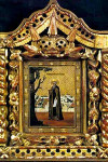 Оте́чества удали́вся, преподо́бне,/ в пусты́ню всели́лся еси́/ иде́же жесто́кое житие́ твое́ показа́л еси́/ и мно́гих доброде́тельми удиви́в,/ дарова́ние чуде́с от Христа́ прия́л еси́./ Те́мже помина́й нас, чту́щих па́мять твою́, да зове́м ти:// ра́дуйся, преподо́бне Ти́хоне, о́тче наш.