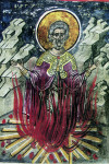 Бжcтвенною рeвностію распалsемь, nгнS сослужaщагw не ўстраши1лсz є3си2, но возшeдъ небоsзненнw в0лею, возгнэщaющимъ nгнeмъ всесожжeгсz, и3 вLцэ ћкw жeртва принeслсz є3си2, м§ниче слaвне є3міліaне, хrтA бGа моли2, даровaти нaмъ вeлію млcть.