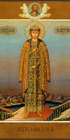 В благоче́стии рожде́нна,/ в стра́се Бо́жии воспита́на,/ в житии́ целому́дрие стяжа́вшаго,/ по успе́нии же нетле́нием телесе́ просия́вшаго,/ благове́рнаго кня́зя Фео́дора во святы́х почита́я,/ смире́нно мо́лимся Тебе́, Всеси́льный Влады́ко,/ да и во ве́ки прославля́еши святы́ми Твои́ми// страны́ на́ша.