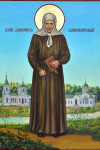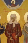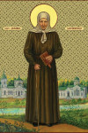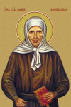 T ю4ности желaніемъ бжcтвенныz любвE разжигaема, суетY житeйскую tри1нула є3си2, смирeніемъ крaйнимъ и3мlтвою непрестaнною мyдрость хrт0ву стzжaла є3си2 и3 въ годи1ну лю1тую kви1ласz є3си2 настaвница и4щущымъ сп7сeніz, тёмже предстоS нhнэ гдcеви въ ли1цэ с™hхъ, поминaй молsщихсz тебЁ, домнjко, мaти бlжeннаz.
