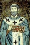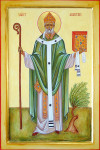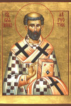 БGосл0ве с™и1телю, цRкве хrт0вы похвало2, настaвниче бlгочeтіz, и3 вёры правослaвныz ўтверждeніе, и3скорени1телю є3ресeй, ўчeній тaинственныхъ сокр0вище, ґvгустjне џтче бlжeнне, с™и1телю преди1вне, моли2 при1снw њ всёхъ нaсъ.