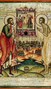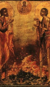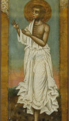 Нагот0ю тэлeсною и 3 терпёніемъ њбнажи 1лъ є 3си 2 вр†жіz ков†рствіz, њбличaz непод0бное є 3гw 2 дэsніе, ѕёльнэ страждA с0лнечный вaръ, и 3 нyждныz вели 6кіz стyдєни мрaза, и 3 nгнS не чyлъ є 3си 2, б9іею п0мощію покрывaемь, їwaнне премyдре: моли 2 њ вёрою творsщихъ пaмzть твою 2, чeстнw и 3 ўсeрднw притекaющихъ къ рaцэ мощeй твои 1хъ, и3збaвитисz t бёдъ, и3 падeніz и3збэжaти.