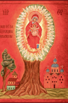 Коли прп. Антоній Печерський (помер у 1072 році) у 1060 році був вигнаний із Києва великим князем Ізяславом (1054-1073), він таємно пішов у межі Чернігова. Там він викопав собі на горах Болдиних печеру і став вести усамітнене подвижницьке життя. У цей саме час ним і була знайдена ікона Божої Матері. Він побачив її на ялині такою, що сяяла світлими променями, тож вона здавалася оточеною вогнем.