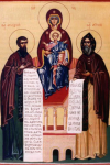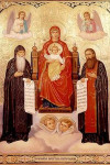 Днесь све́тло торжеству́ет Све́нская оби́тель;/ и ра́дуется явле́нием о́браза Богома́тери;/ Безме́рный лик Пече́рских отце́в/ с ни́ми же и мы непреста́нно вопие́м:// ра́дуйся Благода́тная Све́нская Похвало́.