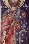 Оде́ждами от крове́й украша́яся,/ Го́сподеви предстои́ши, Царю́ сил, Христофо́ре приснопа́мятне,/ отону́дуже со Безпло́тными и му́ченики пое́ши/ трисвяты́м и стра́шным сладкопе́нием.// Те́мже моли́твами твои́ми спаса́й ста́до твое́.