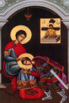 Страдaльчествовавъ д0брэ, безсмeртную слaву наслёдовалъ є3си2 нhнэ, ћкw в0инъ и3зрsдный вLки бhлъ є3си2, мл7твами дими1тріа м§ника: съ ни1мъ ќбw, нeстwре мyдре, молS не престaй њ всёхъ нaсъ.