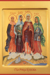 Ца́рствия ра́ди Небе́снаго ми́р и вся́ я́же в ми́ре оста́вили есте́, тесноту́ соверше́ннаго послуша́ния возлюби́вши, ди́вныя подви́жницы и Христа́ ра́ди му́ченицы в годи́ну лю́тых испыта́ний в земли́ Новгоро́дстей процве́тшия, блаже́нныя ма́тери на́ша Евдоки́е, Да́рие, Да́рие и Мари́е, помяни́те на́с у Престо́ла Пресвяты́я Тро́ицы.