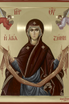 Богородице Приснодево, человеков покрове,/ ризу и пояс пречистаго Твоего телесе,/ державное граду Твоему обложение даровала еси,/ безсеменным рождеством Твоим нетленна пребывающи,/ о Тебе бо и естество обновляется и время./ Темже молим Тя мир граду Твоему даровати/ и душам нашим велию милость.