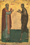 Він же, схиливши коліна, просив у неї благословення. Так самісінько й вона схилилася перед ним, і довго обоє один в одного просили: “Благослови”. Нарешті подвижниця сказала: “Аввo Зосимo, тобі личить благословити й помолитися, тому що ти вшанований саном пресвітерським і багато років, стоячи перед Христовим престолом, приносиш Господеві Святі Дари”.