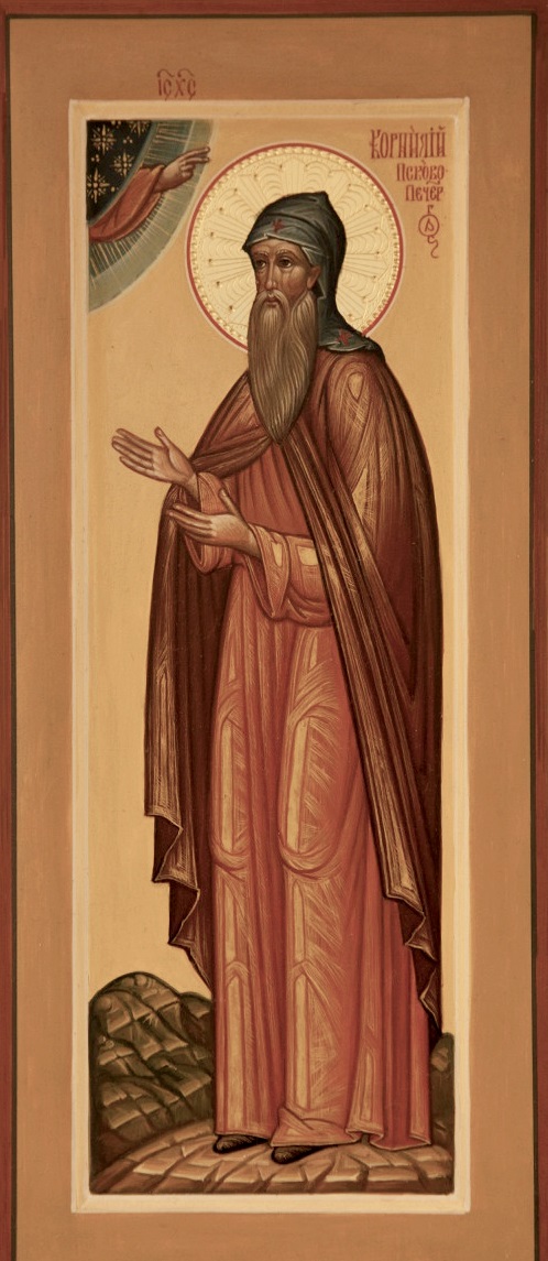 Преподобномученик Корнилій Псково-Печерський (1501–1570) народився в Пскові в боярській сім’ї. Батьки його, Стефан і Марія, виховували сина в благочесті та страху Божому. Уже в ранньому віці мати помітила в отрока Корнилія особливу схильність до духовного життя, навчила його молитви і прищепила любов до мандрівників. Щоб дати синові освіту, батьки віддали його до Псковського Мирозького монастиря. У монастирських стінах отроків виховували в послуху, навчали читання і письма, мистецтва книгописання і писання ікон. У монастирі складалися і переписувалися літописи, житія святих, богослужбові книги. У Мирозькій обителі юний Корнилій подвизався під керівництвом старця, здійснюючи подвиги молитви і праці, робив свічки. З особливою ретельністю готувався він до писання ікон, дотримуючись перед цим посту, молився Пресвятій Владичиці про благословення його на працю. Під час роботи над іконою зберігав власну чистоту, творячи в душі безперестанну молитву.