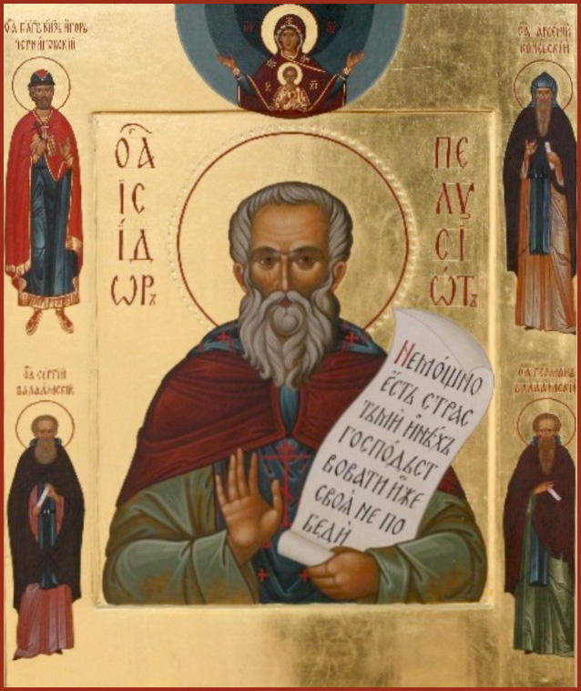 Преподобний Ісидор Пелусіотський жив у IV-V століттях. Родом із Александрії. Виріс у середовищі благочестивих християн. Він був у родинних стосунках із Феофілом, архієпископом Александрійським, і його наступником святим Кирилом. Ще юнаком він залишив світ і пішов до Єгипту на Пелусіотську гору, яка стала місцем його чернечих подвигів. Духовна мудрість і суворий аскетизм преподобного Ісидора в поєднанні з широкою освіченістю і природним знанням людської душі дали йому змогу за короткий час здобути повагу і любов ченців. Вони обрали його своїм настоятелем і возвели в сан пресвітера. Наслідуючи приклад святителя Іоанна Златоуста, якого йому довелося бачити й чути під час подорожі до Константинополя, преподобний Ісидор присвятив себе переважно християнській проповіді, тій “практичній філософії”, що, за його власними словами, є “основою будівлі та самою будівлею”, в той час як логіка “є її прикрасою”, а “споглядання – вінцем”. Він був учителем і безвідмовним подавачем порад для всіх, хто звертався до нього за духовною підтримкою – чи то проста людина, чи то вельможа, чи то єпископ, чи то патріарх Александрійський, чи то сам імператор. Після нього залишилося близько 10000 листів, з яких до нас дійшло 2090. Більша частина цих листів містить глибокі за богословською думкою і водночас морально повчальні тлумачення Священного Писання. Тут преподобний Ісидор виступає як найкращий учень святителя Іоанна Златоуста. Любов і відданість преподобного Ісидора до святого Іоанна Златоуста проявилися в рішучих діях на захист святого Іоанна під час гонінь на нього імператриці Євдоксії та архієпископа Феофіла. Після смерті святителя преподобний Ісидор переконав наступника Феофіла, святого Кирила Александрійського, вписати ім’я святого Іоанна Златоуста в церковні диптихи як сповідника. З ініціативи преподобного Ісидора було скликано III Вселенський Собор в Ефесі (431), на якому було засуджено лжевчення Несторія про Особу Іісуса Христа.