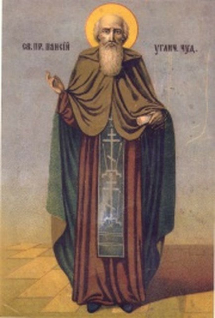 Христо́вы ра́ди любве́ оте́чество и род оста́вил еси́/ и, а́нгельскому житию́ поревнова́в,/ духо́вному отцу́ твоему́ преподо́бному Мака́рию, подража́тель быв,/ гра́да У́глеча дости́гл еси́,/ и близ того́ при вода́х в пусты́ню, А́нгелом пока́занную, всели́лся еси́,/ и оби́тель прекра́сну Ма́тери Бо́жией воздви́гл еси́,/ и мно́жество мона́хов собра́л еси́,/ и́мже и наста́вник ко спасе́нию быв,/ и чуде́с дарова́ния от Бо́га прия́л еси́,/ Паи́сие преподо́бне,// моли́ Христа́ Бо́га спасти́ся душа́м на́шим.