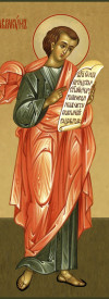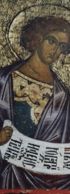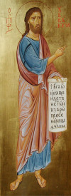 Возгласи́вый вселе́нней от ю́га прише́ствие Бо́жие от Де́вы, Авваку́ме богоглаго́ливе,/ и на Боже́ственней стра́жи предстоя́нием/ слы́шания от светоно́сна а́нгела/ Христо́во Воскресе́ние возвести́л еси́ ми́ру,/ сего́ ра́ди ве́село зове́м ти:// ра́дуйся, проро́ков све́тлая добро́то.
