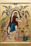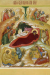 Де́ва днесь Пресу́щественнаго ражда́ет,/ и земля́ верте́п Непристу́пному прино́сит,/ А́нгели с па́стырьми славосло́вят,/ волсви́ же со звездо́ю путеше́ствуют:/ нас бо ра́ди роди́ся// Отроча́ Мла́до, Преве́чный Бог.