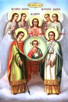 Нбcныхъ в0инствъ ґрхістрати1зи, м0лимъ вaсъ при1снw мы2 недост0йніи: да вaшими мл7твами њградитE нaсъ кр0вомъ кри1лъ невещeственныz вaшеz слaвы, сохранsюще ны2 припaдающыz прилёжнw и3 вопію1щыz: t бёдъ и3збaвите ны2, ћкw чиноначaльницы вhшнихъ си1лъ.