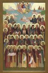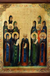 Днесь лик святых в земли нашей Богу угодивших,/ предстоит в Церкви и невидимо за ны молится Богу:/ Ангелы с ним славословят,/ и вси святии Церкви Христовы ему спразднуют,// о нас бо молят вси купно Превечнаго Бога.