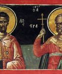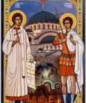 От мирския молвы избегосте и к тихому пристанищу преставистеся,/ мученичества кровьми и постничества трудами венчаеми./ Темже и показастеся мучеников и преподобных единовсельницы.
