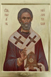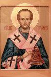 Уго́дниче Бо́жий ми́лостивый,/ святи́телю о́тче на́ш Павли́не,/ вои́стину доброво́льно зра́к раба́ прии́м/ и те́м Самому́ Христу́ после́дуя,/ положи́л еси́ ду́шу твою́ за лю́ди своя́, и от зла́го плене́ния те́х изба́вил еси́./ Свободи́ и на́с моли́твами твои́ми/ от плене́ния страсте́й на́ших/ научи́ на́с ми́лостивны к бли́жним свои́м бы́ти,/ да пребу́дет чрез то́ ми́лостив и к на́м Госпо́дь,// спаса́яй ду́ши на́ша, я́ко бла́г и человеколю́бец.